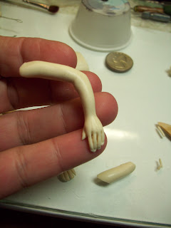 tiny wrist bones were added and smoothed in.. the bone structure in the top of the hand was sculpted as well..remember, there are no straight lines in the body even if slight, every part has a curve, or a roundness. I admit often my tiny fingers could use more rounding..they appear flat and sharp..that's a no no!